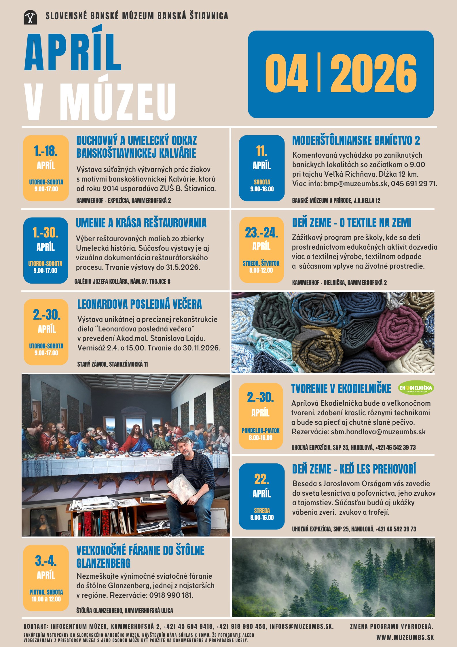 Slovenské banské múzeum v Banskej Štiavnici pripravilo pre svojich návštevníkov bohatý aprílový program, ktorý prepája technickú históriu regiónu s duchovným, umeleckým a ekologickým odkazom súčasnosti.