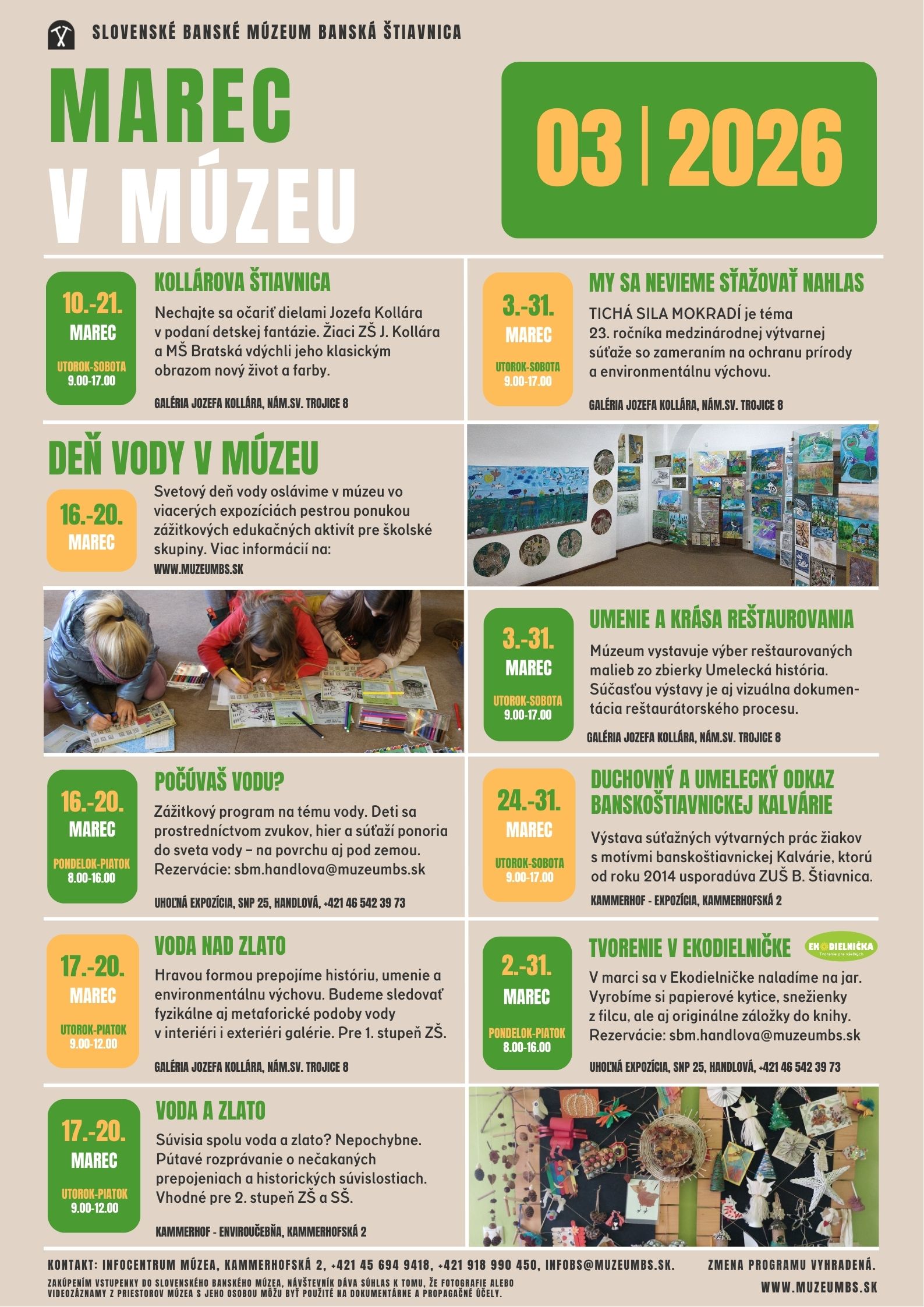 Slovenské banské múzeum (SBM) vstupuje do jarnej sezóny 2026 s bohatou ponukou podujatí, ktoré prepájajú umenie, históriu, environmentálnu výchovu aj tvorivé dielne. Marcový program je rozložený do viacerých expozícií v Banskej Štiavnici a Handlovej a cieli nielen na individuálnych návštevníkov, ale predovšetkým na školské skupiny a mladú generáciu.