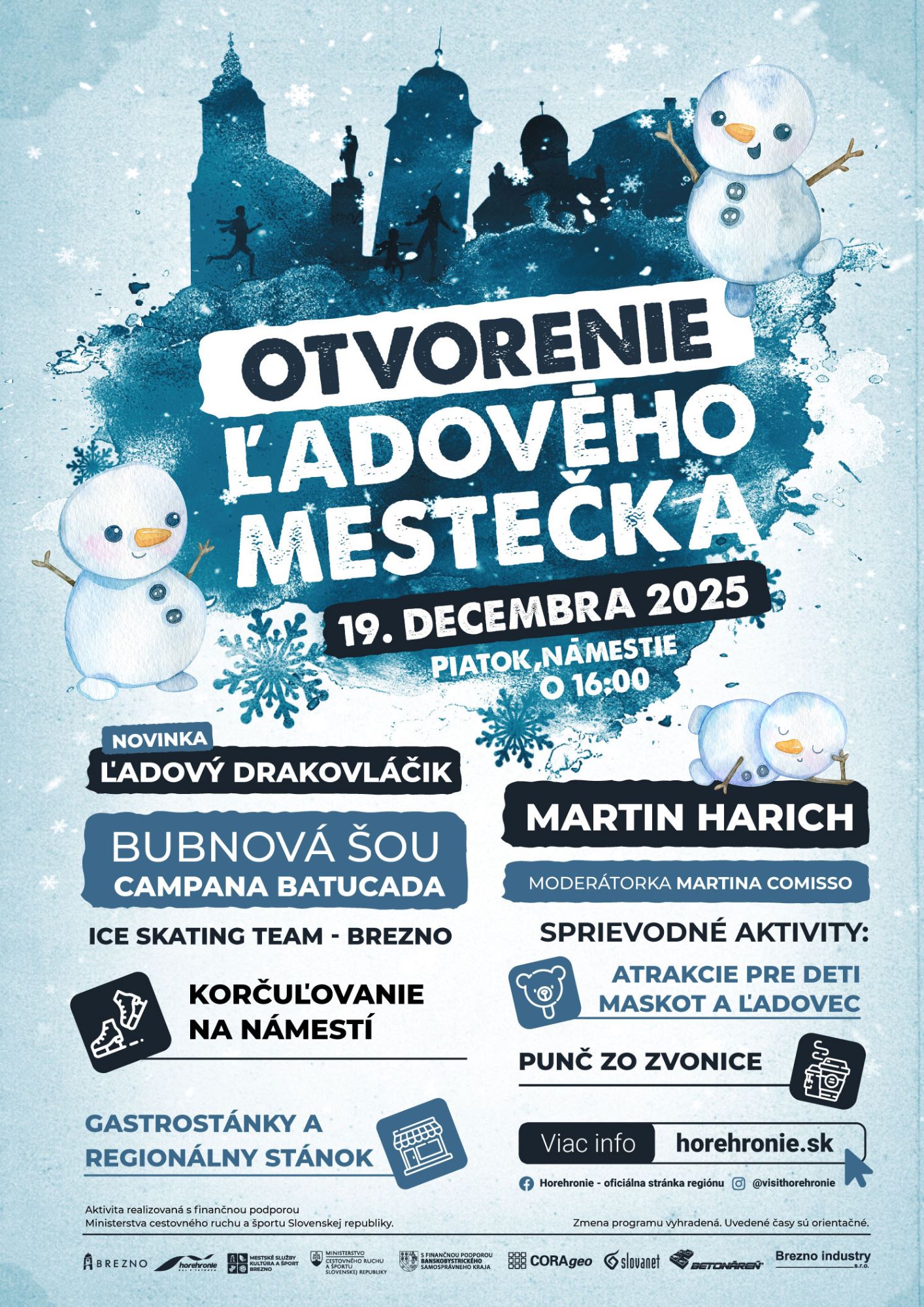 Okrem mobilnej ľadovej plochy, rozprestierajúcej sa v historickom centre, na viac ako 300 m2, bude otvorenie sprevádzané slávnostným sprievodom za účasti pána primátora a Bubnovou šou CAMPANA BATUCADA. Následne sa na ľadovej ploche predstavia mladé krasokorčuliarske talenty z Ice Skating Team - Brezno. Pódium bude patriť slovenskému spevákovi Martinovi Harichovi, známeho zo speváckej televíznej relácie Superstar.
