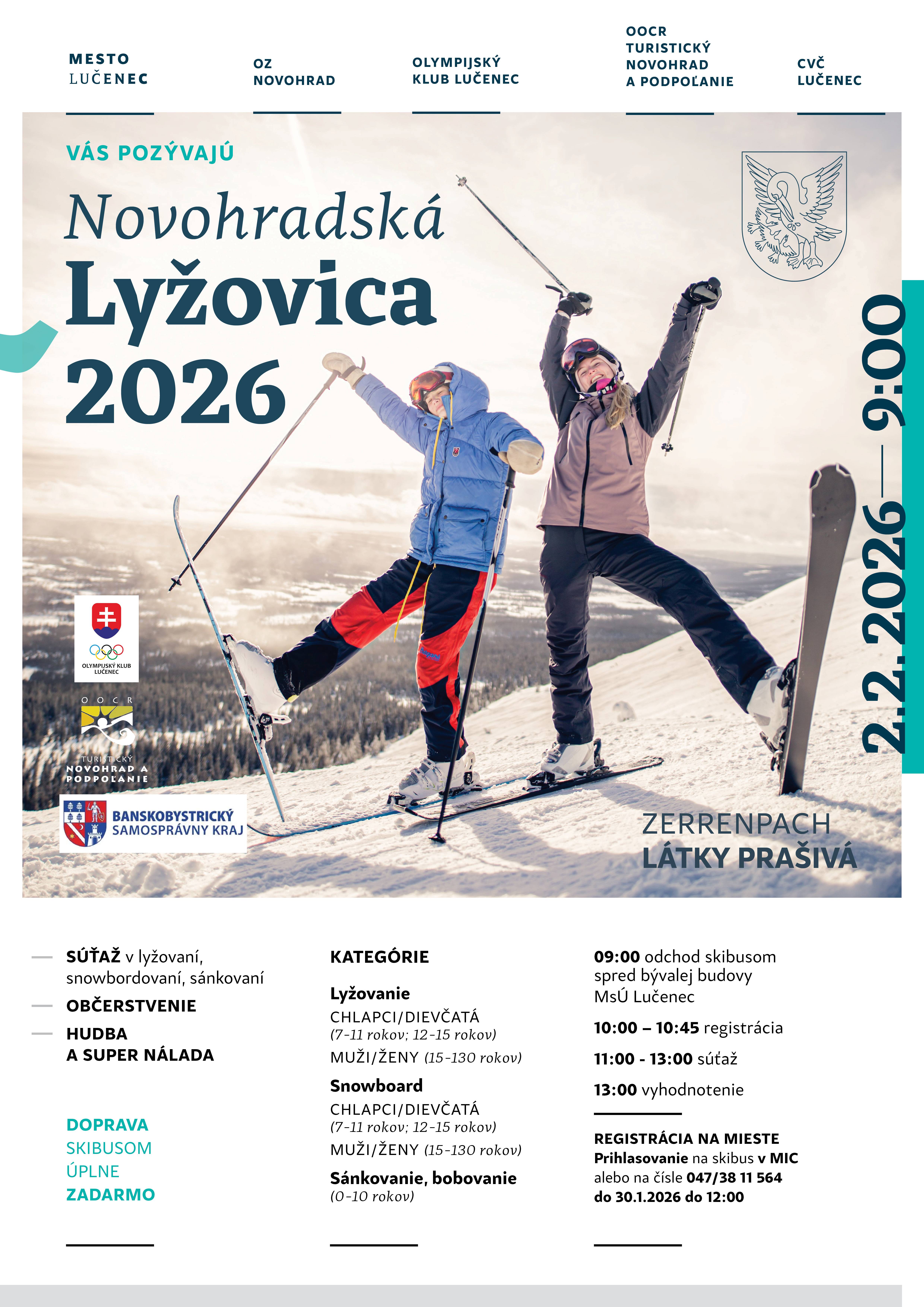 Mesto Lučenec v spolupráci s partnermi si Vás dovoľuje pozvať na obľúbené zimné športové podujatie Novohradská Lyžovica 2026, ktoré sa uskutoční v pondelok 2. februára 2026 počas polročných prázdnin v lyžiarskom stredisku Zerrenpach Látky – Prašivá.