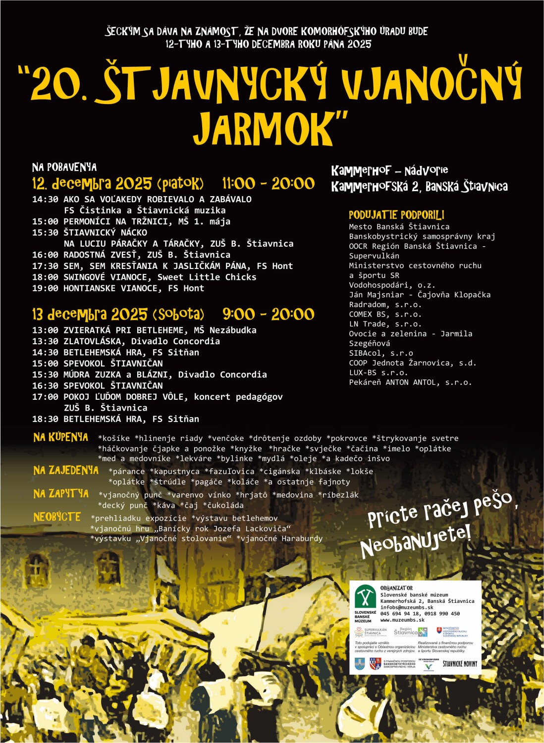 Slovenské banské múzeum s radosťou oznamuje, že do historických priestorov Kammerhofu v Banskej Štiavnici už onedlho zavíta jubilejný 20. ročník Štjavnyckého vjanočnýho jarmoku. V dňoch 12. – 13. decembra 2025 ožije najväčší mestský objekt opäť vôňou medoviny, tradičných vianočných dobrôt, folklórom, remeslami a neopakovateľnou predvianočnou atmosférou.